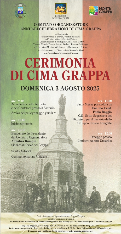 Domenica 3 agosto, importante evento. Siamo sempre onorati come associazione di partecipare a tale evento, oramai sono undici anni che siamo invitati a partecipare alla grande manifestazione di commemorazione dei caduti sepolti a Cima Grappa, presso il Sacrario. Negli ultimi undici anni siamo riusciti a riportare in Grappa la vecchia tradizione delle genti venete che in occasione della festa del Grappa salivano a Cima Grappa per celebrare una festa di ringraziamento estiva. La salite veniva effettuata dalle genti delle tre provincie: Vicenza, Treviso e Belluno. Abbiamo rievocato questo impegno con tre associazioni che ogni anno salgono a Cima Grappa dalle tre provincie e questo per far rivivere questa antichissima tradizione li cui origini si perdono nei secoli.