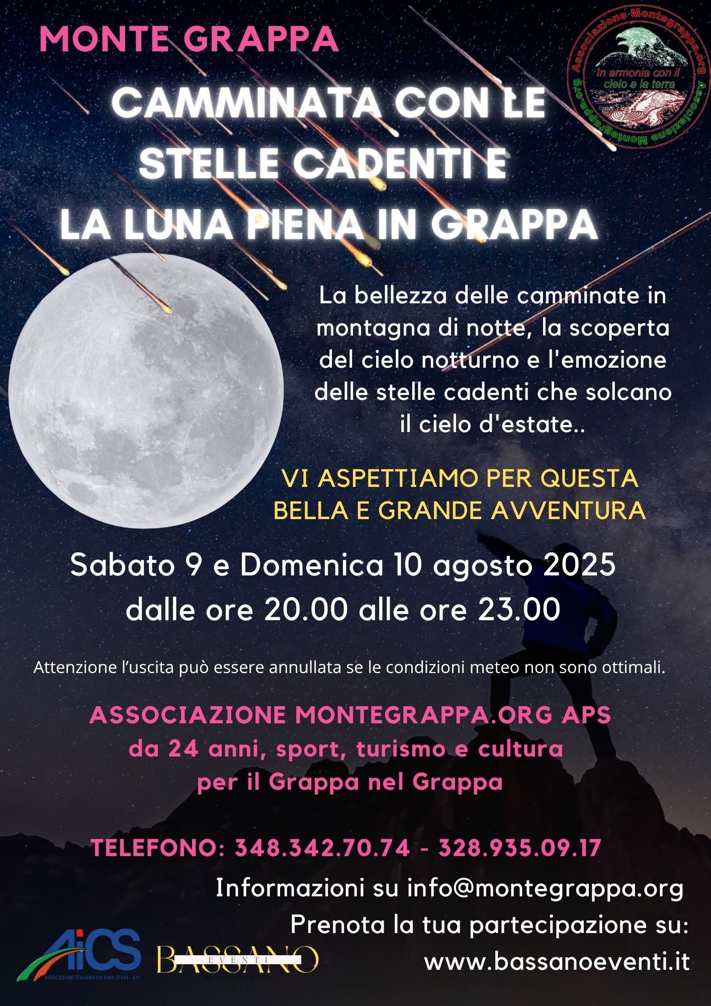 ATTENZIONE: PRENOTAZIONI CHIUSE per sabato sera. C'è disponibilità domenica 10 e martedì 12, ma affrettatevi a iscrivervi. Vi aspettiamo Sabato 9 agosto 2025 per una bellissima camminata per raggiungere un posto panoramico e ammirare le stelle cadenti e la luna piena di agosto sul Massiccio del Grappa! Una passeggiata semplice e piacevole di circa 6 km, immersi nel crepuscolo, ci porterà a vivere questa splendida esperienza. Faremo una sosta in un punto panoramico dove potremo osservare gli sciami meteoritici della stagione. Ricordiamo che i primi 15 giorni di agosto sono davvero speciali per questi eventi, perché avremo la fortuna di vedere diversi sciami accompagnarci: Alfa-Capricornidi, Aquaridi meridionali, Omega-aquaridi meridionali, Alfa-Pesceaustralidi, Pesceaustralidi e le mitiche Perseidi, che come ogni anno in questo periodo raggiungono il loro massimo della loro attività.