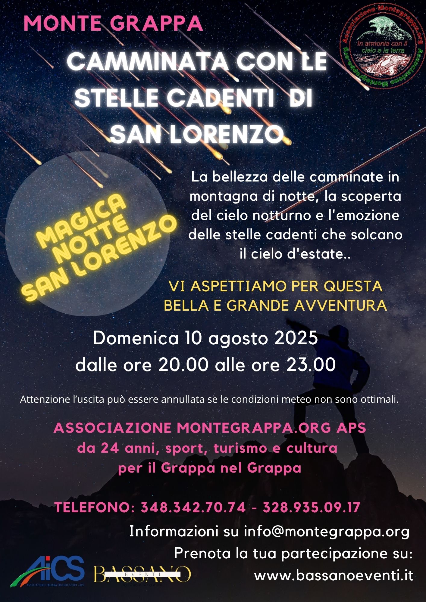 Vi aspettiamo Domenica 10 agosto 2025 per una bellissima camminata nella notte di San Lorenzo per raggiungere un posto panoramico e ammirare le stelle cadenti nella magica notte delle stelle cadenti. In questa occasione potremmo ammirare anche la luna piena di agosto sul Massiccio del Grappa! Una passeggiata semplice e piacevole di circa 6 km, immersi nel crepuscolo, ci porterà a vivere questa splendida esperienza. Faremo una sosta in un punto panoramico dove potremo osservare gli sciami meteoritici della stagione. Ricordiamo che i primi 15 giorni di agosto sono davvero speciali per questi eventi, perché avremo la fortuna di vedere diversi sciami accompagnarci: Alfa-Capricornidi, Aquaridi meridionali, Omega-aquaridi meridionali, Alfa-Pesceaustralidi, Pesceaustralidi e le mitiche Perseidi, che come ogni anno in questo periodo raggiungono il loro massimo della loro attività.