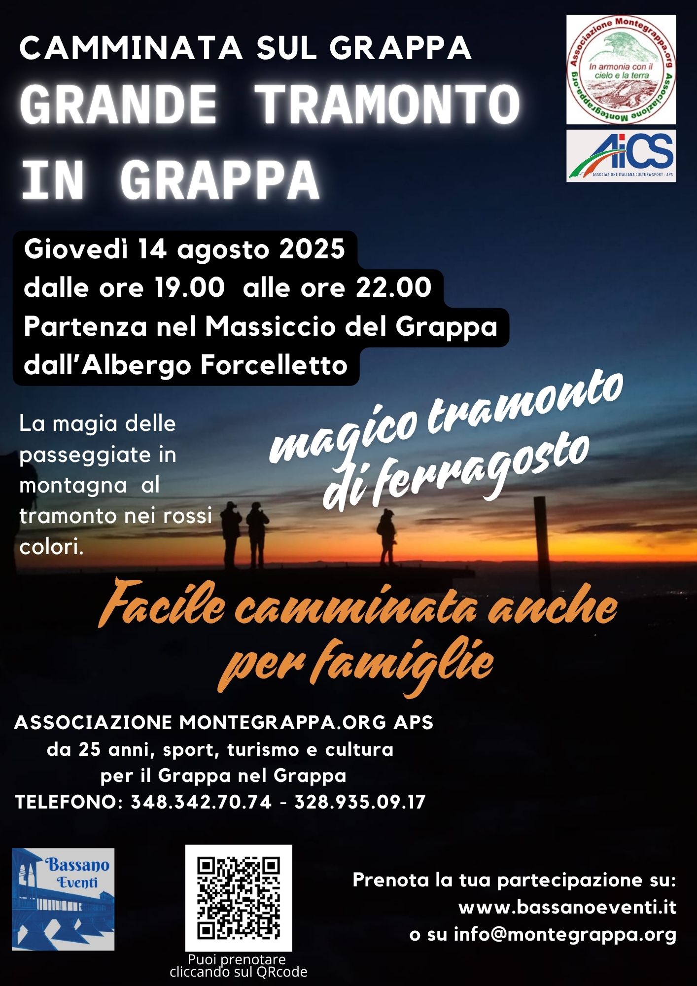 Giovedì 14 agosto 2025, interessante camminata in Grappa al tramonto in questo periodo estivo, possiamo chiamarla la camminata di ferragosto. La camminata al tramonto in Grappa ci porterà ad ammirare il tramonto dalla cima del Col di Buratto che con i suoi 1468 rivolto completamente a ovest ci darà un'immagine stupenda del tramonto del sole sull'Altopiano dei Sette Comuni. L'esperienza di camminare al tramonto in montagna è sempre una bellissima avventura e quindi vi porteremo a camminare nella zona centrale del Grappa e saliremo a quota 1468 per poter godere al meglio il tramonto del sole sulle montagne dell'altopiano di Asiago. Per noi dell'associazione che amiamo particolarmente questo genere di uscite è sempre una bellissima occasione per poter rinnovare negli anni questo sublime esaltazione di caldi colori emanati dal sole morente. Come dicevano gli antichi Egizi è un momento magico in cui il sole scende nella "Duat", si rinnova e si fortifica per essere nuovamente vivificante e far nascere un nuovo giorno. In definitiva il tramonto è una fase della vita ed è essenziale per il rinnovamento della stessa.